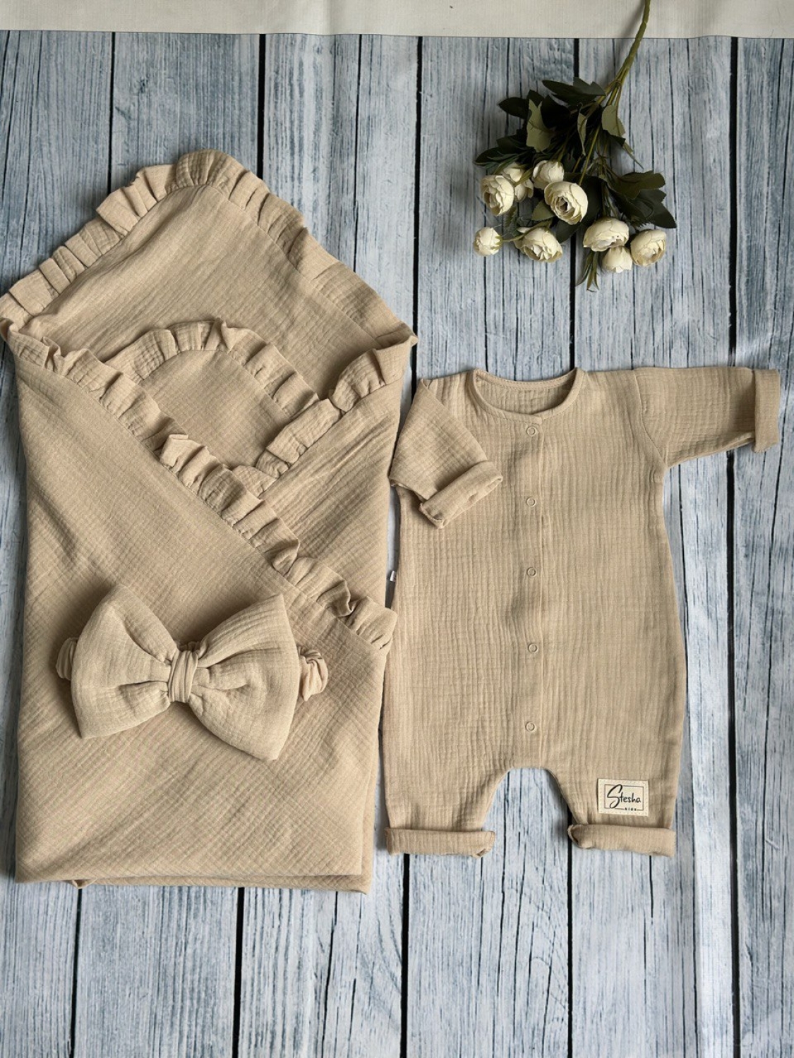 335-К. Комплект из детского комбинезона, р 56 и конверта муслин, хлопок 100% 90/90 см, кофейный